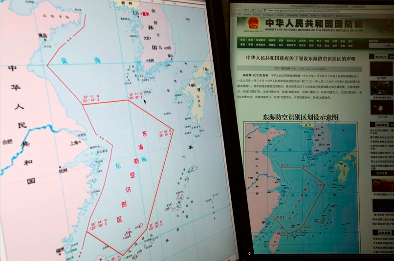 Picture: Computer screens display a map showing the outline of China's new air defense zone in the East China on the website of the Chinese Ministry of Defense, in Beijing on Nov. 26. Chinese characters in red in the center of the map at left reads: "Air Defense Identification Zone in East China Sea." (AP Photo)