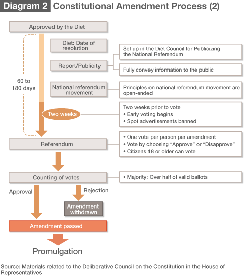 Now that the Act on Procedures for Amendment has come into effect, it is possible for a constitutional amendment to be proposed to the people as long as it is approved by at least 100 members of the House of Representatives and at least 50 members of the House of Councillors. However, three important conditions apply.
