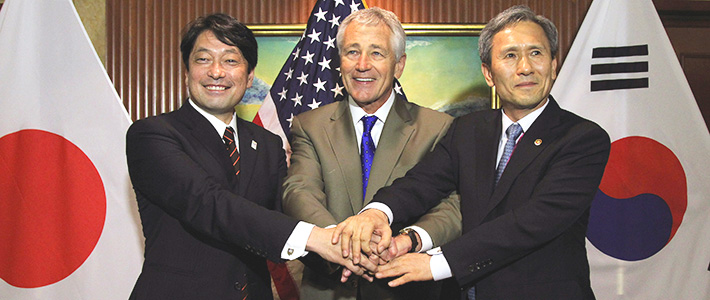 เอเชียตะวันออกเฉียงเหนือถือไดเว่าเป็นพื้นที่ที่มีข้อความขัดแย้งซึ่งสหรัฐฯได้เข้ามามีความเกี่ยวช้องทั้งกรณีเกาหลีเหนือ-ใต้อันทำให้เกาหลีใต้และญี่ปุ่นสามารถร่วมมือเพื่อเผชิญภัยคุกคามร่วมกันได้